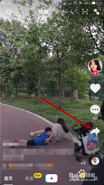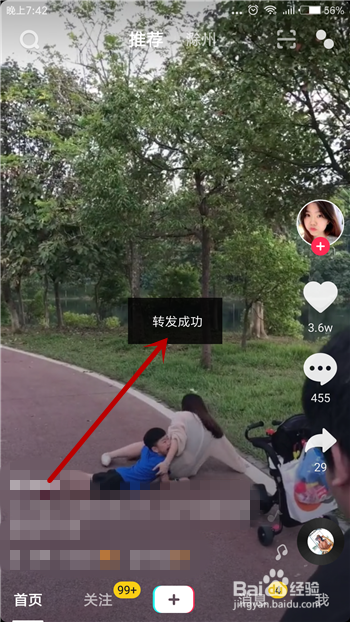 进入到抖音后起头播放保举视频,若是想转发该视频到本身抖音上就点击右侧【转发】。