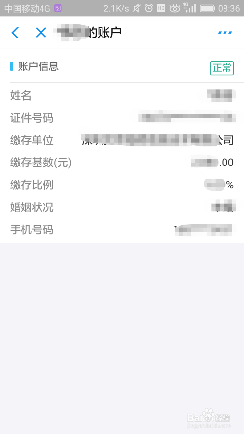 进入公积金小我的账户界面,查看公积金账户信息,如:缴存单元、缴存基数等,如图: