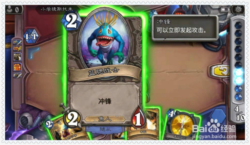 再将“蓝腮兵士”打出,因蓝腮兵士具有冲锋结果,所以打出后同时打脸对方英雄。