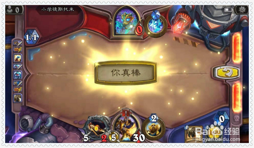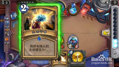 然后,将手中的“生而平等”牌打出,将所有侍从的生命置1,狂野炎术师的所有侍从造当作1点危险的结果清空场上侍从,触发提里奥.佛丁亡语,为英雄装备一把灰烬使者兵器。