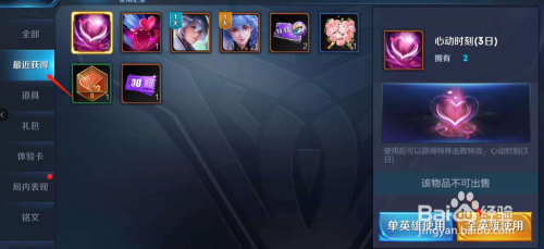 获得后,我们再在比来获得中找到心动时刻击败特效,然后点击右下角的利用,(可给指定英雄,也可以全员利用,都行),如许我们就装备当作功了。