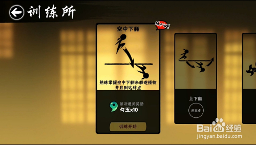 忍者必需死3中的练习营是晋升技巧的好去向,一起头系统会放置练习,我们来看一下空中下翻如何通关。