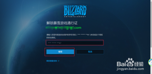 第九步,输入你手机收到的暴雪发送的短信验证码,然后点击继续,如图所示。