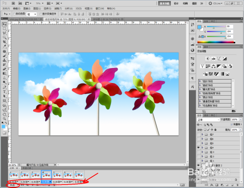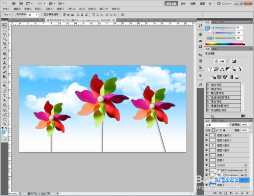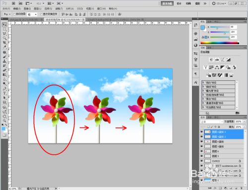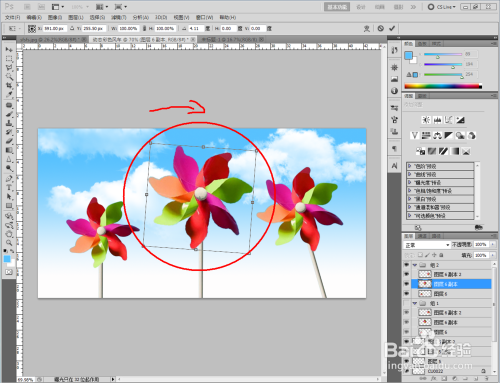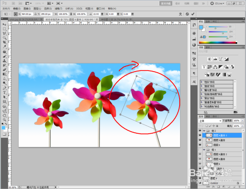 将做好的组1拉动至【新建图层】图标处新建一个组2,并将组2中的风车进行恰当的扭转;将做好的组2拉动至【新建图层】图标处新建一个组3,同样将组3中的风车进行恰当的扭转。按照如许的步调依次做好七个组(如图所示);