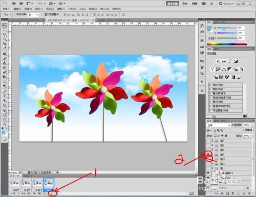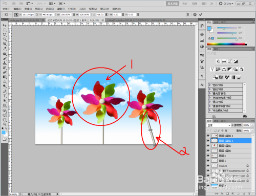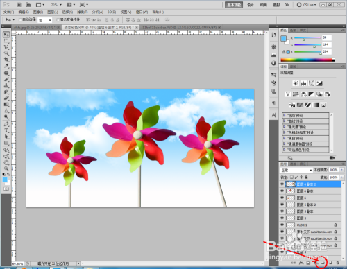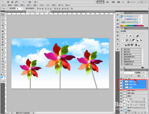 将做好的风车的两部门图层拉进来,按住【Alt】键后进行移动复制。按住【Ctrl】+【T】,别离对风车大小和位置进行调整。完当作后,点击右下角【新建组】图标新建一个组(组1),将三个风车扭转部位拉进组1中(如图所示);