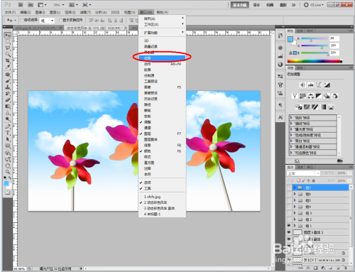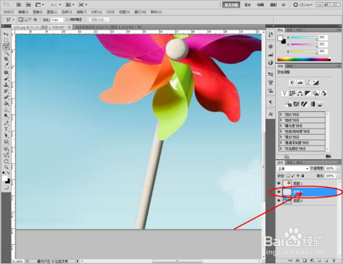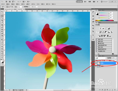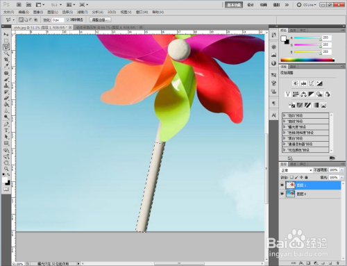 打开Photoshop(CS5)软件,打开一张彩色风车图。点击【多边形套索东西】,将彩色风车扭转部位勾勒出来,按住键盘【Ctrl】+【J】进行复制图层。以同样的步调建造出风车杆图层;