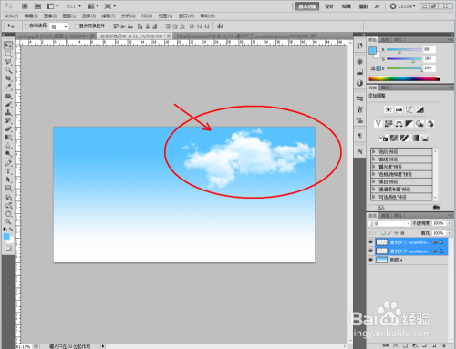 新建一个文件,将前景色设置为蓝色,布景色设置为白色后,点击【渐变东西】,给空白图层做出蓝白渐变结果。拉入psd云素材后,按住【Alt】键进行移动复制,做出天空布景图;