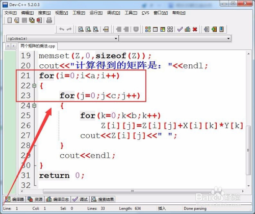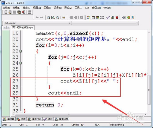 用两层for轮回,节制矩阵的乘法,并输出乘法所得的成果。
