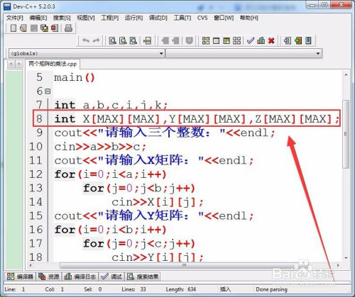 接着,界说三个整型二维数组,保留A、B和C矩阵的各元素。
