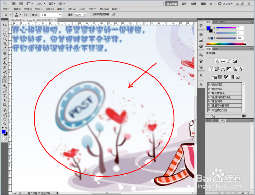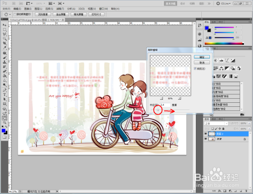 打开Photoshop(CS5)软件,将找好的第一张图片打开。点击左边东西栏【恍惚东西】,设置好恍惚东西笔头的大小与强度后,对图片需要恍惚处置的部门进行涂抹(如图所示);