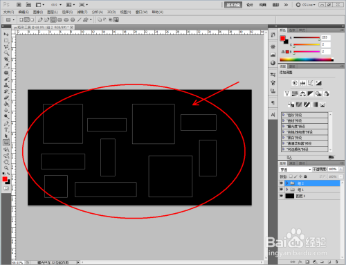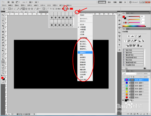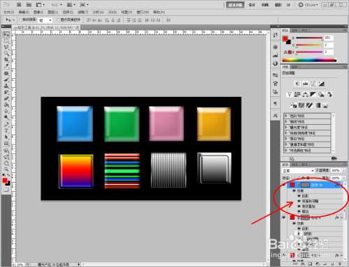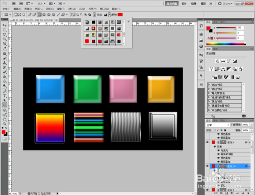 外形图层可以进行图案样式选择。点击【样式】旁边的小图案进行样式选择(注:点击右边小三角,可以载入更多的图案样式),我们以几个样式为例来对矩形东西进行操作;