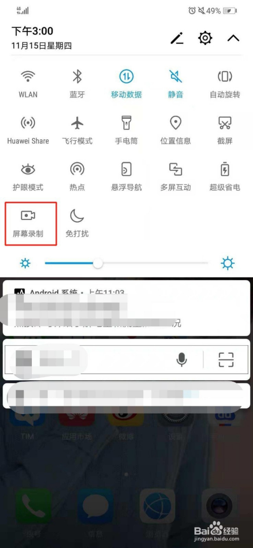 然后从手机顶手下滑,下滑显示出屏幕本家儿页功能键,此中底部有一个“屏幕录制”功能键,点击进入