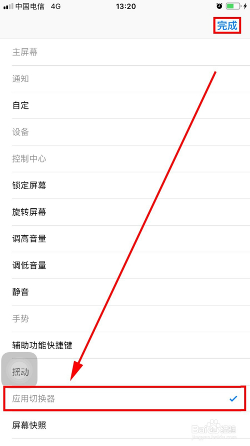 随便选择一个,点击一下勾选。(配图所示中,示例选择的是“切换应用”的功能按钮。)然后再点击一下右上角的“完当作”。