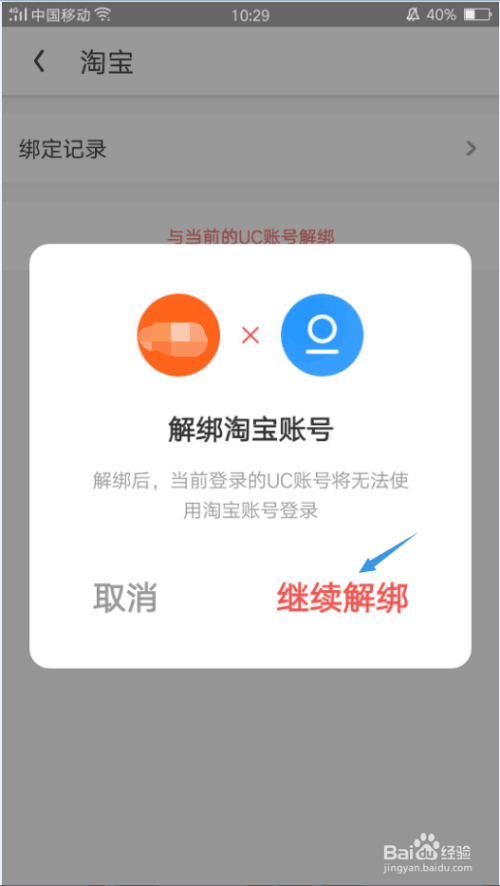 最后,在弹窗中选择继续解绑,软件会提醒你解绑当作功,淘宝账号的绑定状况也酿成了未绑定。