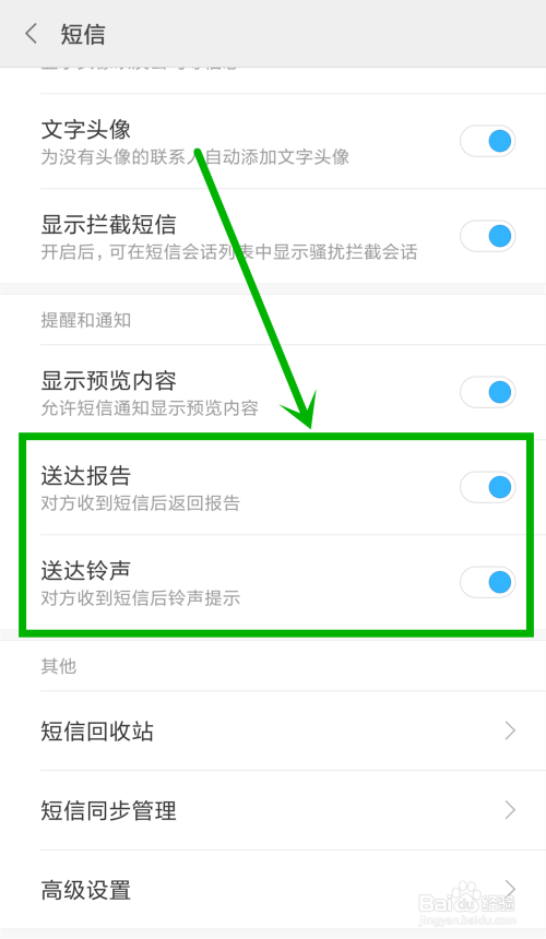 在短信的设置界面下拉找到【送达陈述】和【送达铃声】选项,然后别离开启后面的按钮就行了,如许就会收到送达陈述