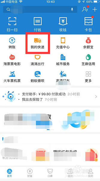 登录APP后,进入付出宝首页。在首页上找到【我的快递】图标(如图所示,若是首页上没有找到该图标,可以在【更多】里找),点击该图标,进入我的快递本家儿页!