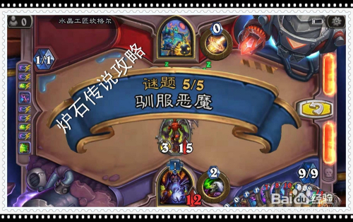 首先,打出手中的暗藏者卡牌,将对方场中任一一个炮台尖兵覆灭失落,触发尖兵亡语回满法晶,同时因炮台尖兵“在你的敌手利用一张侍从牌后,进犯该侍从”的属性,刚打出的暗藏者被进犯覆灭失落,再次触发亡语,为对方呼唤出一个新的炮台尖兵;接着利用手中的亮石技师卡牌,为手中所有侍从牌进犯力加2,生命值加2,同时被对面尖兵覆灭;再打出手中的污手街供货商卡牌,使手中侍从牌进犯加1,生命加1,同时被对方残血的尖兵交换失落;再打圣光表率,因其进犯年夜于3,故具有吸血结果,被对方尖兵覆灭,时代为英雄吸血10点;接着打燃鬃.自走炮,因吸血结果,再为英雄吸血15点,并换失落两个尖兵;最后,打圣光表率,继续吸血,回满英雄生命,过关。
