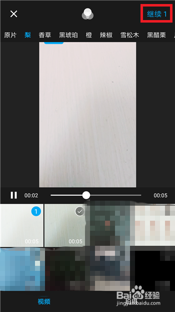 点击后会打开我们手机中的视频界面,找到适才保留到手机中的抖音视频并选择,然后点击右上角的【继续】。