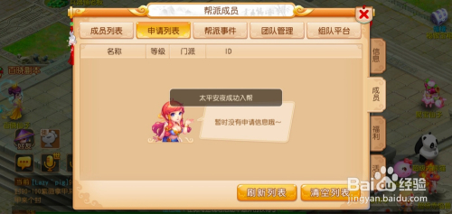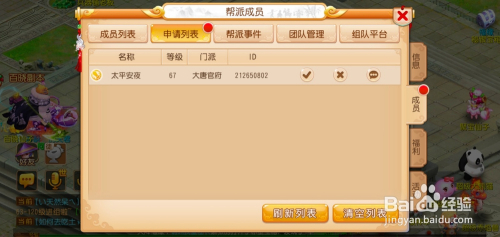 申请列表的页面,会显示想申请进入帮派的玩家,点击对勾。