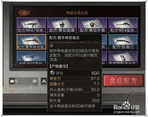而莫辛纳甘狙击配方的介绍则是,可以建造莫辛纳甘狙击枪,经典的老派狙击枪,威力不老派,同样需建造谙练度达到30级后可利用此配方。