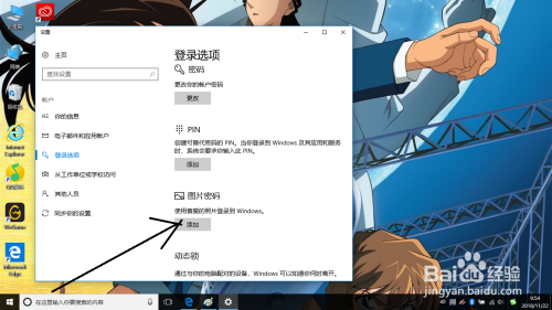 打开登录选项后在这个界面中找到图片密码选项设置中点击添加按钮。