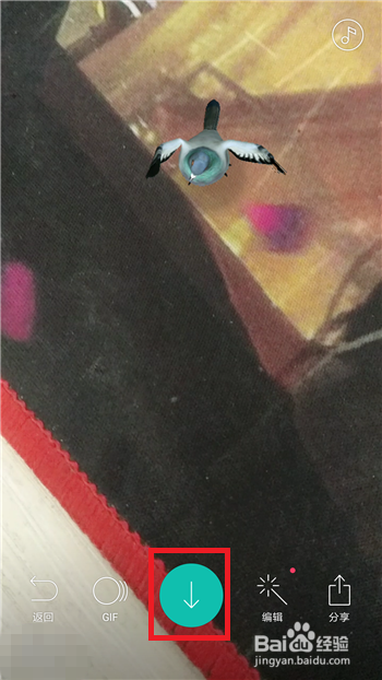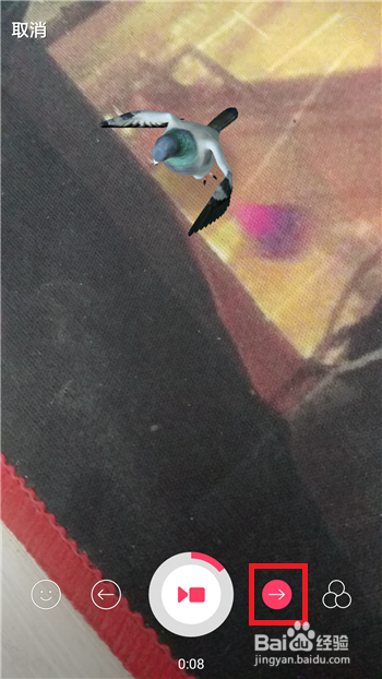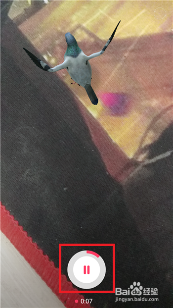 利用这个贴纸后就能在镜头中看到鸽子在跳舞了,点击【录制】按钮起头录制视频。