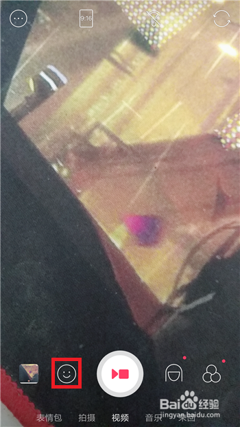 在录制视频的界面中点击左下角的【贴纸】选项,如图所示。