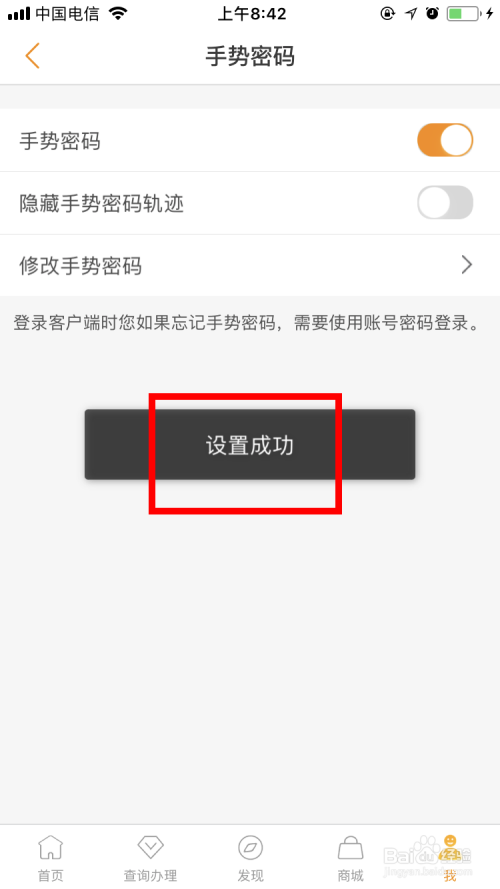OK,设置当作功。今后就可以用新的手势密码登录电信营业厅App了。