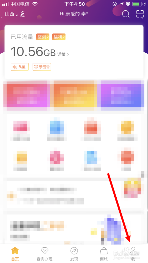首先在手机上打开并登录电信营业厅App,并在首页面点击右下角的 我 。