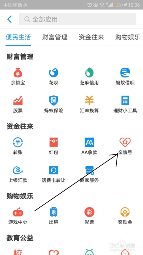 打开付出宝之后找到亲情号页面进口。