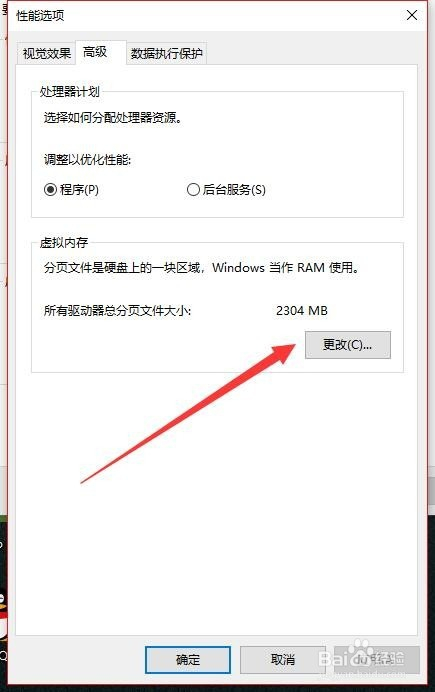 点击机能后我们可以在高级中的下面看到虚拟内存,这里我们可以看到所有驱动器总分页文件大小为2304M,点击更改