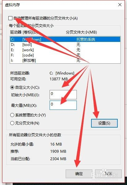 更改的时辰首先点击打消主动办理所有驱动器文件大小的选项,然后选择自界说大小,将初始大小和最年夜值都改为0,然后点击设置,在点击确定