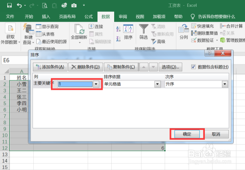 在排序面板本家儿要关头字选择1后点击确定。