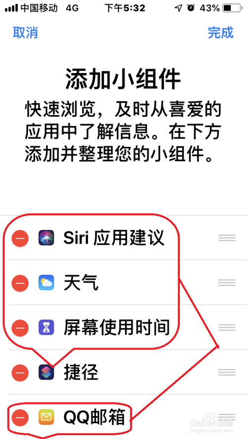 多余组件删除完当作后,添加“捷径组件(已添加的话,保留即可)”,最后点击右上角“完当作”即可。