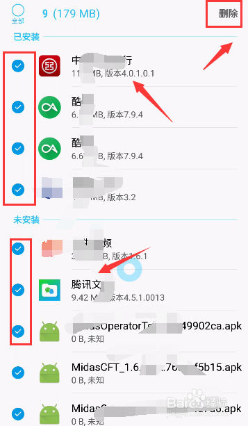 选择你不需要的apk击以安装过的文件,点击删除,如下图所示