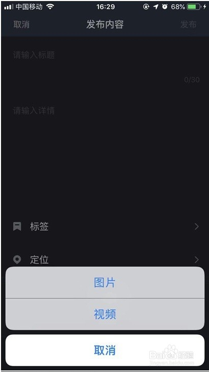 在发布内容中有图片和视频的选择,分享你的所看所见,图片限制9张,视频有必然的大小限制。