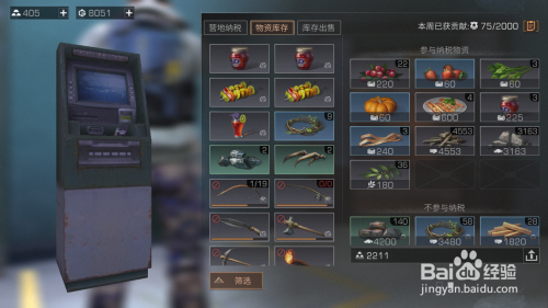 进入到物资库存的界面,左侧就是本身背包内的物品,右侧就是营地物资库的物品,左侧的背包就是可以拔取要捐募的物资。