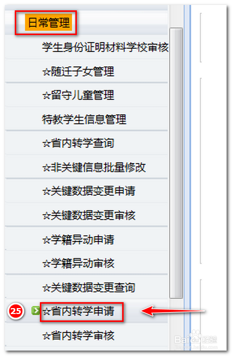 打开【日常办理】后,点下面的【省内转学申请】(在第25项今后挨次还会有可能转变)。