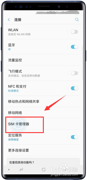 进入毗连界面,点击sim卡办理器进入,可以看到移动数据今朝是sim卡1.如下图所示
