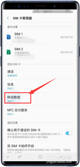 进入sim卡办理器,点击移动数据,如下图所示