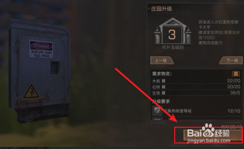 将明日之背工游中的庄园进级为3级,首先需要将本身的采集、建造、战斗的谙练度都晋升到10级以上。这三种谙练度可以经由过程采集道具,建造道具、击打僵尸等活动来晋升。