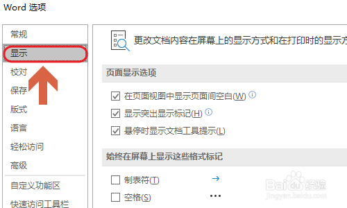 别的去失落段落标识表记标帜还有别的一种方式,那就是依次点击“文件”-“选项”,在word选项对话框的左侧点击“显示”,然后将段落标识表记标帜前面的复选框打消勾选即可;