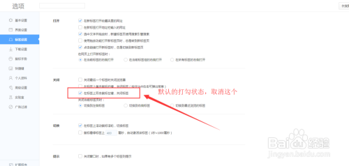 找到【在标签上鼠标双击鼠标左键,封闭标签】,默认为打勾的激活状况,我们选择去失落这个打勾状况,如图所示~