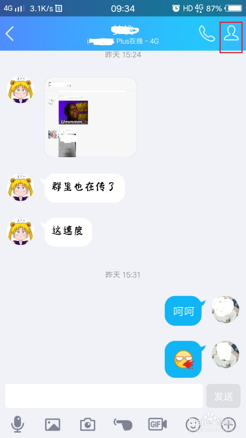打开聊天页面,后点击聊天页面右侧上方的人像图标,如图所示。