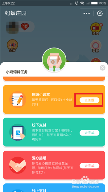 如许在打开领饲料使命中我们就能找到【庄园小讲堂】了,大师点击【去答题】即可起头回覆问题。