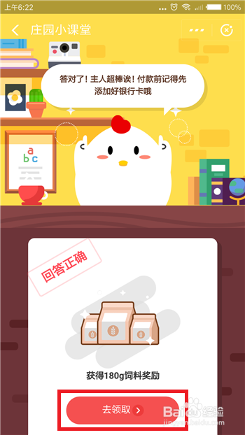 点击后系统会提醒我们回覆问题准确,然后点击此中的【去领取】。