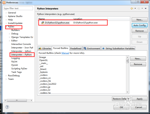 打开 窗口->首选项(Window->Preferences...) 对话框,从右侧的树形列表中选择" PyDev"->"Interpreter Python", 点击新建(New)按钮,从Python的安装路径下选择Python.exe,然后会弹出一个对话框让你勾选System PYTHONPATH,点确定,如下图所示: