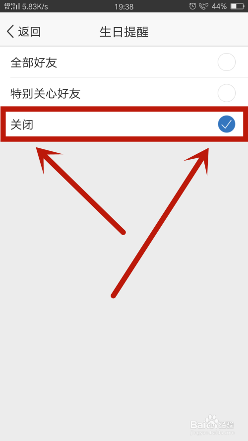 在生日提醒中,选择封闭,即可遏制老友生日提醒功能,如图所示