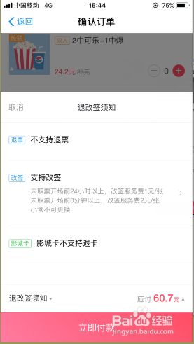 确定座位转到付条目页面,确定采办的场次、座位、时候、影院等信息。 确认无误后点击 当即付条目 即可