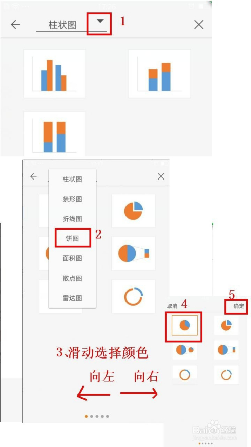 第四步,点击更多图标选项后,点击柱状图右侧的倒三角图标——选择饼图——接着就标的目的左滑动屏幕选择本身喜好的饼图颜色——选好颜色后点击一种饼图类型(在这里选择第一个密封圆形饼图)——点击确定。
